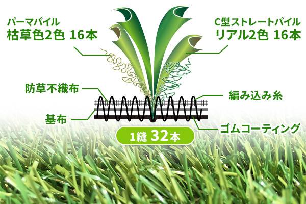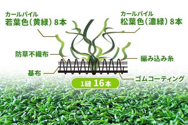 - カールパイル人工芝(グリーンエリア)C型ストレートパイル人工芝(アプローチエリア)