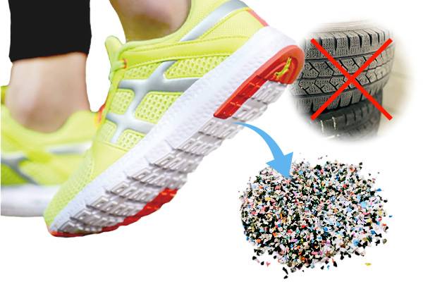 裏面に古タイヤゴムを使用せず、スニーカー等の生産時に出るバリをチップにしたものを100%再利用しています。それにより、ゴム特有の臭いを気にせずご使用いただけます。