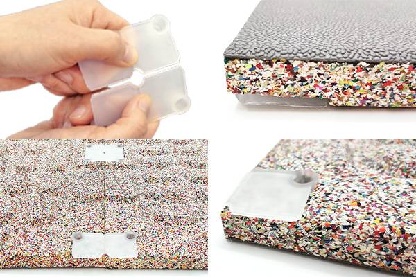 付属のジョイントプラを連結部分にはめ込み、接着剤なしで連結しマット同士のズレを防止します。また、マット同士を連結する事によって、1枚にかかる衝撃を分散する事ができます。