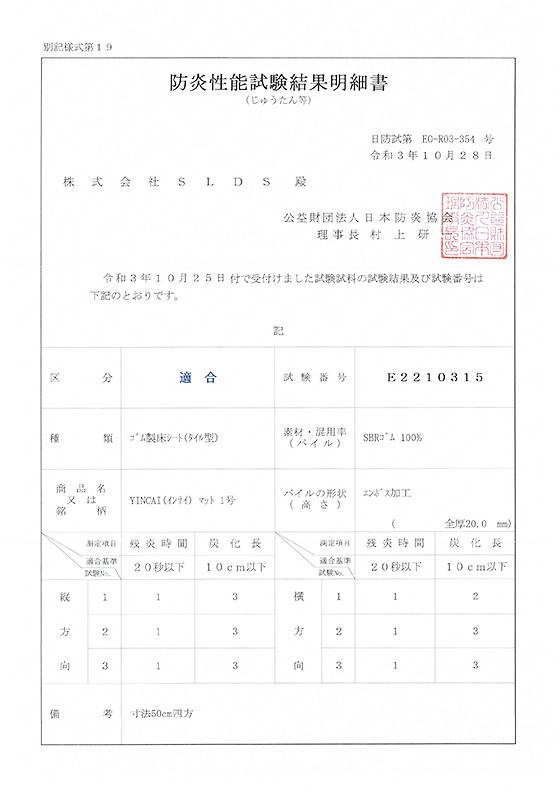 《YINCAIゴムマット》 は公益財団法人日本防炎協会の認定試験を合格し、